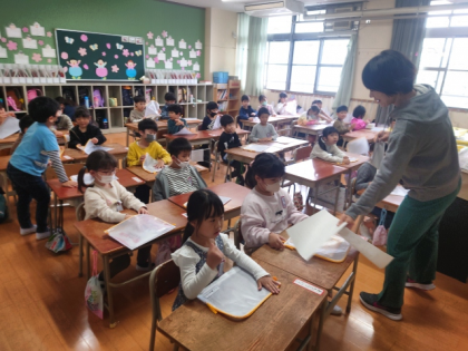 教室で、担任が配るプリントを受け取り、後ろの席にまわしていきます。