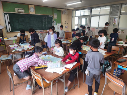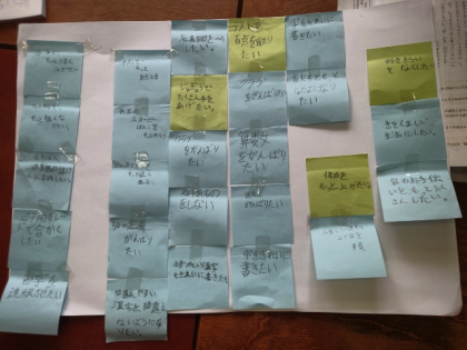学級活動の時間に、4年生の1年間でがんばりたいことを付せんに書き出し、グループで仲間分けをしています。