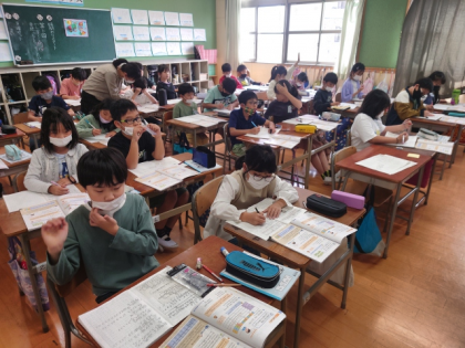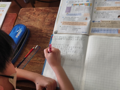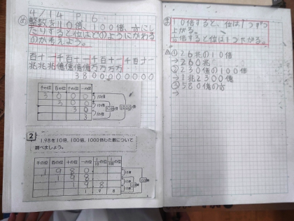 算数科の時間は、整数を10倍、100倍、1/10すると、位がどのように変わるのか、表を書いて調べ、わかったことについて話し合いました。