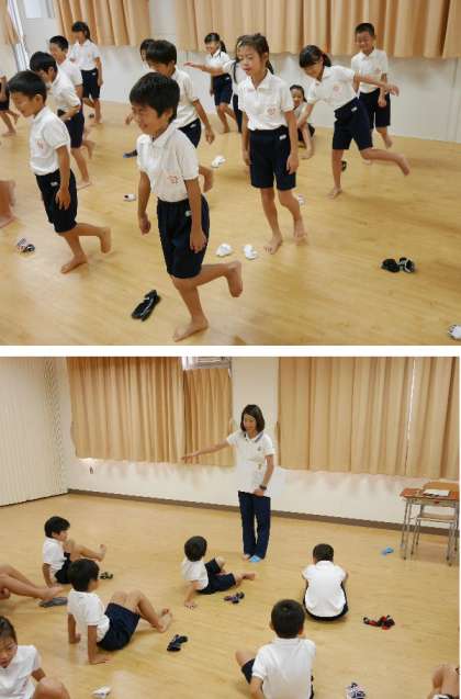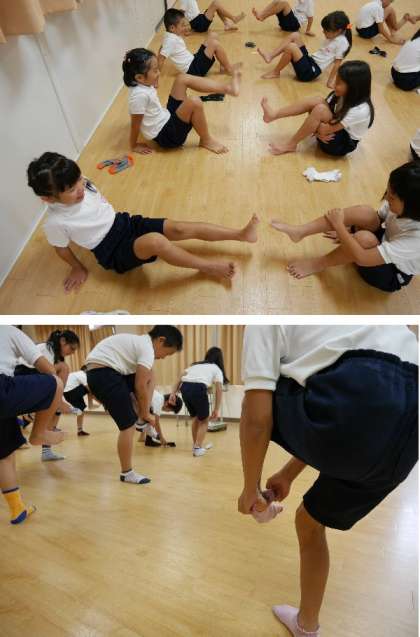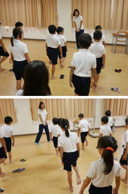 今日の発育測定は3・4年生です。発育測定の前に保健室の先生から、健康にまつわるいろいろなお話を聞きました。まずは、片足でバランスをとったり、足指でジャンケンしたり、片足でくつしたをはいたりと、楽しみながら体験しました。足指を鍛えると早く走れるようになるんですって。なかなか興味深いお話もありましたね。