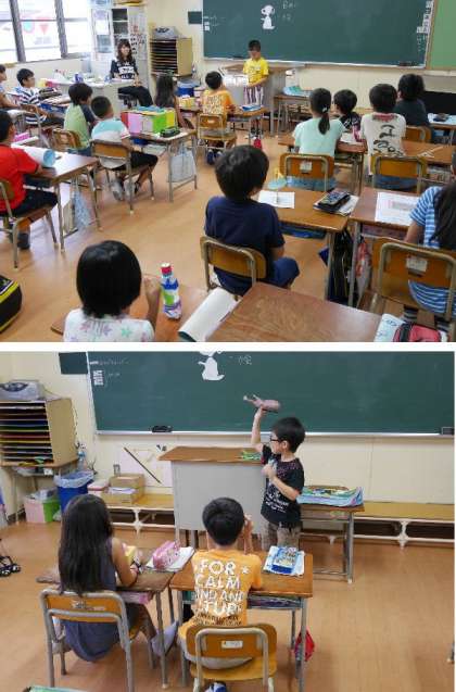 夏休みの自由研究をクラスでみんなの前で発表しています。よくかんがえられていますね。