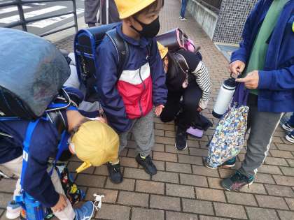 1人では取り切れずに困っていると、いろいろな学年の子どもたちが自然と集まってきて、「ひっつきむし」を取るのを手伝ってくれました。