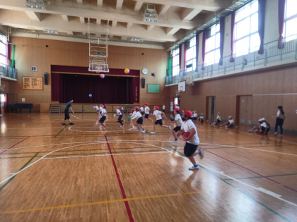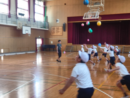 体育科の時間は、走りながらボールを上に投げてキャッチする運動をしました。