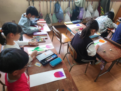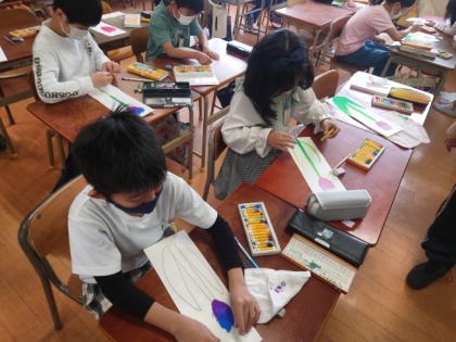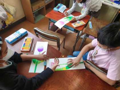 図工科の時間は、パスでチューリップを描いた後、指でこすって広げ、色をぼかして仕上げました。