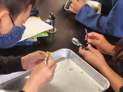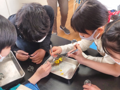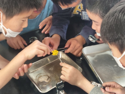 理科の時間は、理科室でアブラナの花のつくりを虫メガネで観察しました。