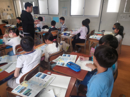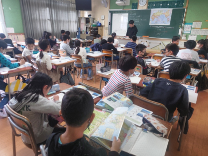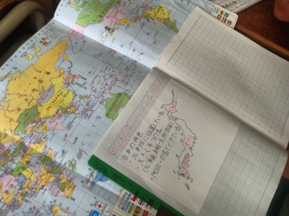 社会科の時間は、日本の国土はどんな特色があるのか教科書や地図帳で調べました。