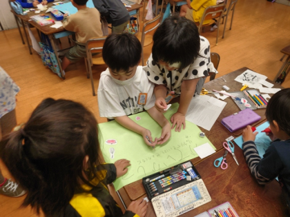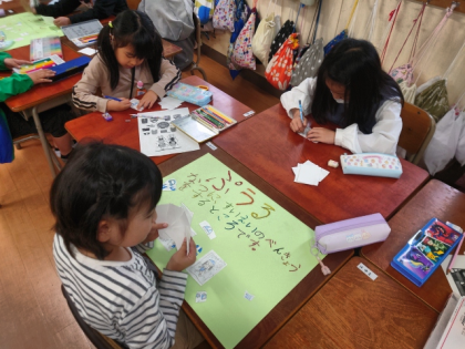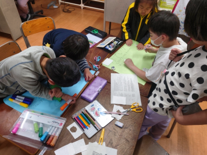生活科の時間は、グループに分かれて、体育館や保健室、理科室、学習室など、学校のいろいろな部屋や教室を1年生に紹介するポスターを作っています。