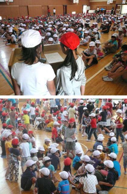 縦割り班でなかよし集会をおこないました。みんなが仲良くなるためにゲームをして楽しみました。代表委員会のひとが「いつゲームするんですか?」と言うと、みんなが「今でしょ!」と大きな声で答えます。