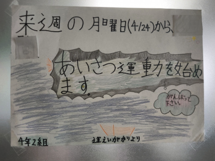 クラスの「うんえい係」が、来週から「あいさつ運動」をするようです。