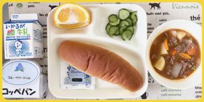 今日の献立は、ビーフシチュー・きゅうりのサラダ・あまなつかん・コッペパン・ブルーベリージャム・牛乳でした。