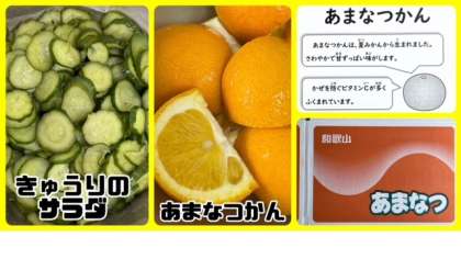 あまなつかんは、1人1/4切れずつつきます。今日のあまなつかんは、和歌山県産のものです。