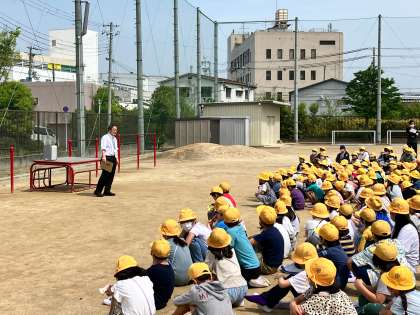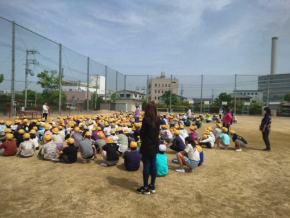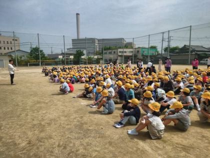 全校の子どもたちが避難場所の運動場に集合したあと、校長と生活指導担当から「自分の命を守ること」についての話をしました。