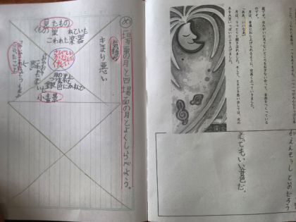 国語科の時間は、「こわれた千の楽器」の物語を読んで、一場面の「月」と四場面の「月」を比べて、ノートにまとめました。