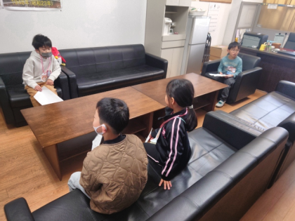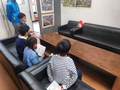 2年生が1年生をやさしくリードし、学校のことを教えています。