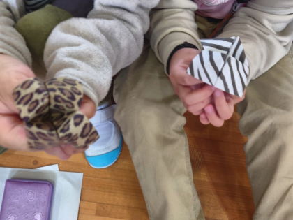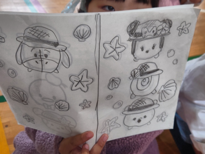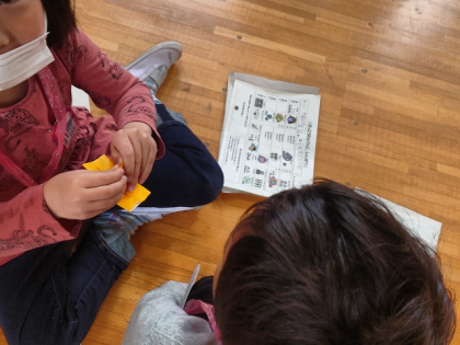 講堂に戻ってきたとき、2年生が1年生に折り紙やお絵かきなど、いろいろな遊びを教えていました。