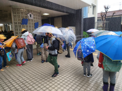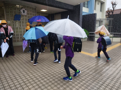 子どもたちは、傘をさして登校してきました。