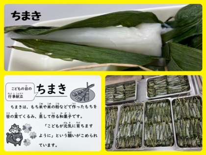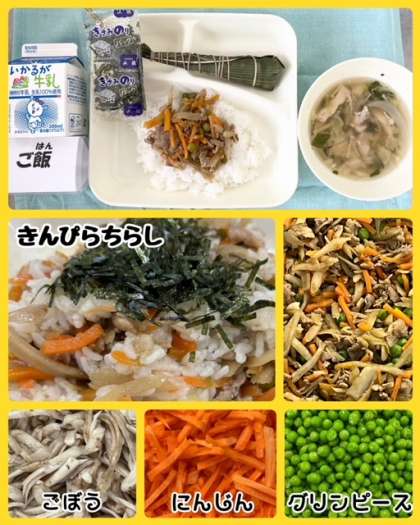 今日の献立は、きんぴらちらし・すまし汁・ちまき・牛乳でした。こどもの日の行事献立です。