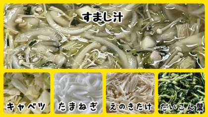 すまし汁は、鶏肉・キャベツ・たまねぎ・えのきたけ、青みにだいこん薬を使用しています。