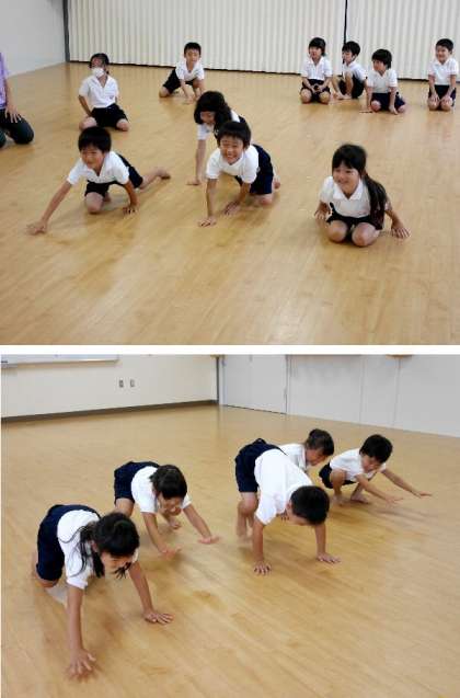 発育測定は1年生ですべて終わりです。発育測定の前に、9月9日救急の日にちなんで、ケガしたときの対処について、保健室の先生からお話がありました。また、こけたときに顔から倒れて大けがしないように、手をつく練習をしました。腕立てやハイハイ、カエルとびと楽しんでいました。