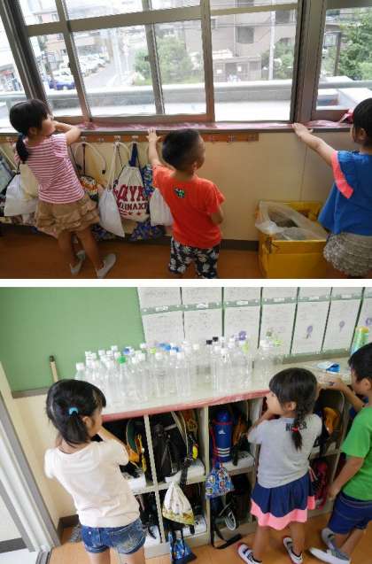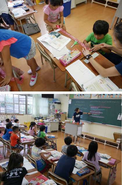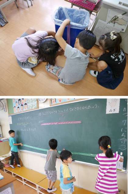 1年生の算数では、ながさを測ってくらべてみました。教室の縦と横のあるものの長さをテープで実際に長さを写し取って、長さを比べてみました。グループで協力して楽しく学習できましたね。