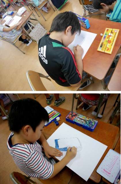 2年生が自分のふで箱を描いています。立体の描き方をしっかり頭にいれながら上手に描けたかな。けっこうむずかしいね。
