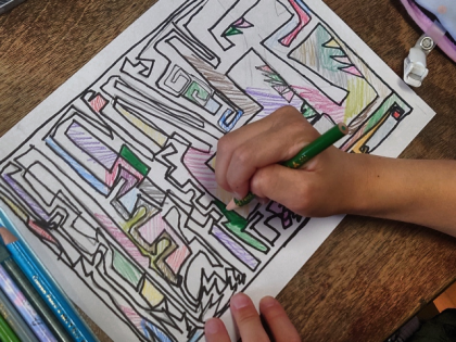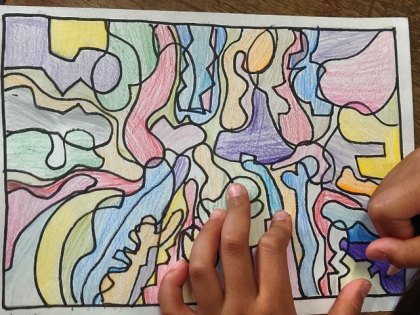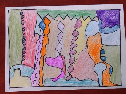 図工科の時間は、画用紙にサインペンで線を描き、色えんぴつで色を塗っていきました。