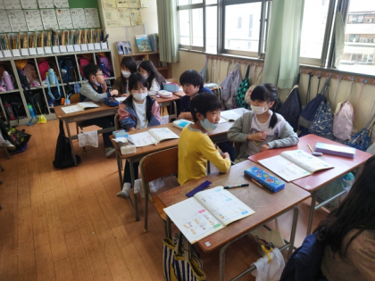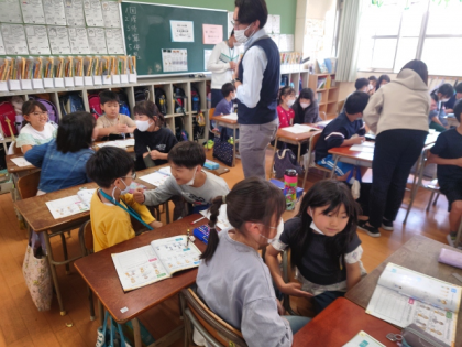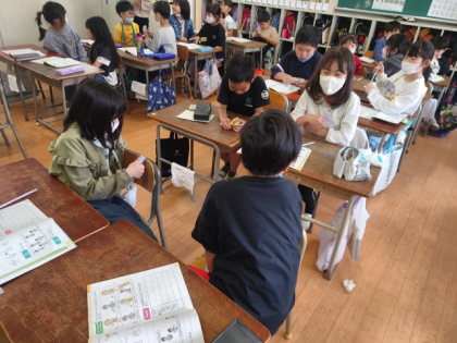英語活動の時間は、"Tired""Sad""Happy""Hungry"など、気持ちや気分を表す言葉を使って、どんな様子かを相手にたずねる英語の表現を学習しました。