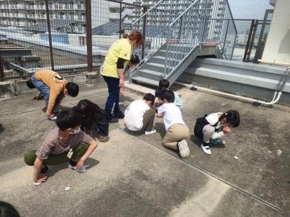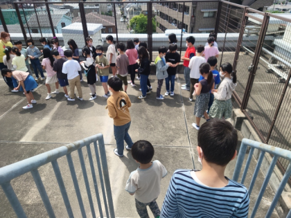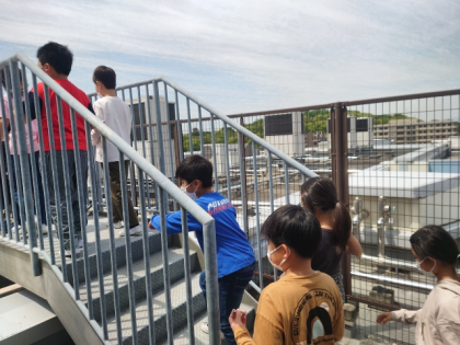 社会科の時間は、方位磁針の使い方を教わったあと、屋上に上がって学校のまわりのようすを見ました。
