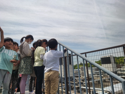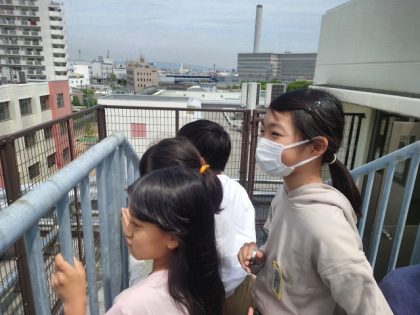 社会科の時間は、方位磁針の使い方を教わったあと、屋上に上がって学校のまわりのようすを見ました。