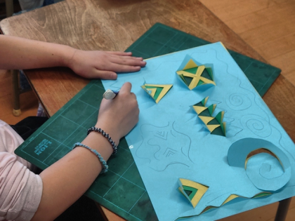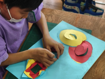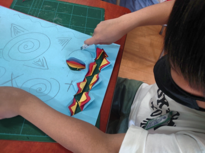 図工科の時間は、カッターナイフを使って画用紙を切り、いろいろなデザインの作品を制作しています。