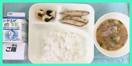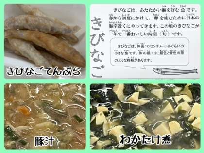 今日の献立は、きびなごてんぷら・豚汁・わかたけ煮・ごはん・牛乳でした。