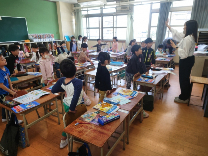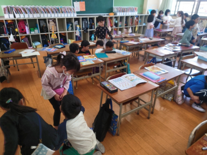 算数科の時間は、担任が手をたたいた数を数えて、その数の友達と手をつないで座ります。