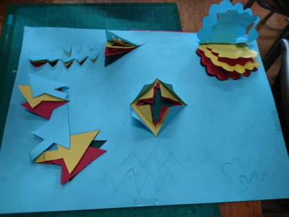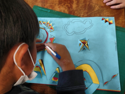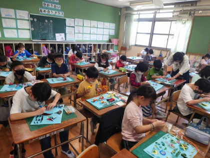 図工科の時間は、カッターナイフを使って画用紙を切り、いろいろなデザインの作品を制作しています。