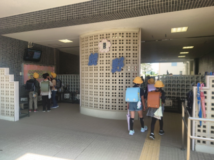たくさんの子どもたちが、元気よくあいさつをしています。