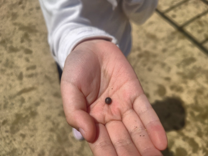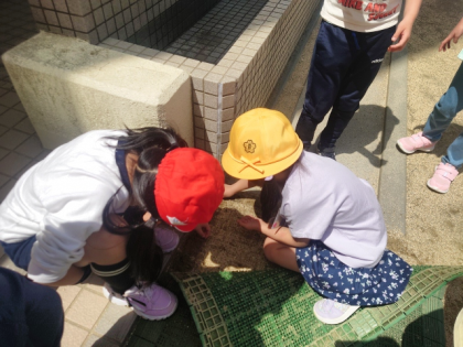 低学年の子どもたちが、校庭でダンゴムシを探していました。
