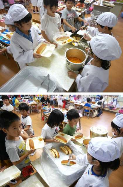 1年生の給食係も一生懸命にやっています。だいぶ慣れてじょうずになりました。