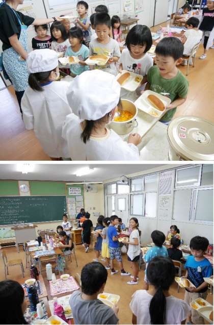 今日は子どもたちの大好きな缶詰ミカンが登場しました。ミカンのおかわりに並ぶ子どもたちの列ができていました。