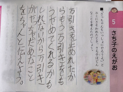 道徳の時間は、教材文「さち子のえがお」の学習をしました。