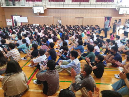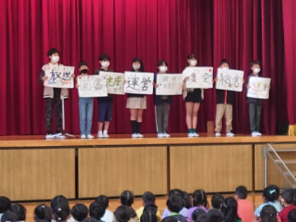 コロナ禍の間は、オンラインで児童集会を行っていましたが、数年ぶりに全校児童が集まって行いました。