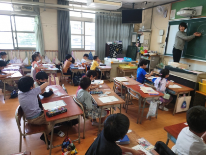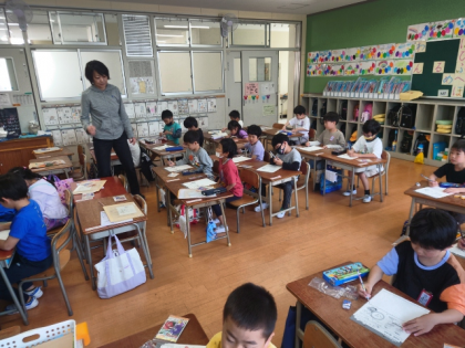 生活科の時間に、子どもたちは担任からあさがおの種を受け取りました。