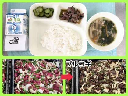 今日の献立は、プルコギ・とうふとわかめのスープ・きゅうりの甘酢づけ・ごはん・牛乳でした。