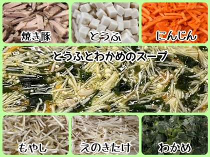 スープは、焼き豚・とうふ・にんじん・もやし・えのきたけ・わかめを使用し、豚骨スープで旨みとコクをだしています。