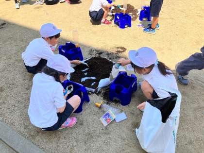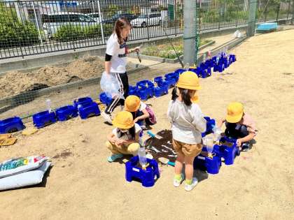 自分たちで植木鉢に土を入れ、小さな穴を開けて種を入れます。