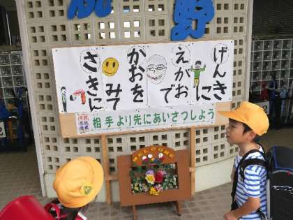 今月の生活目標は、「相手より先にあいさつをしよう」です。気持ちをこめてあいさつできるようにしましょう。
