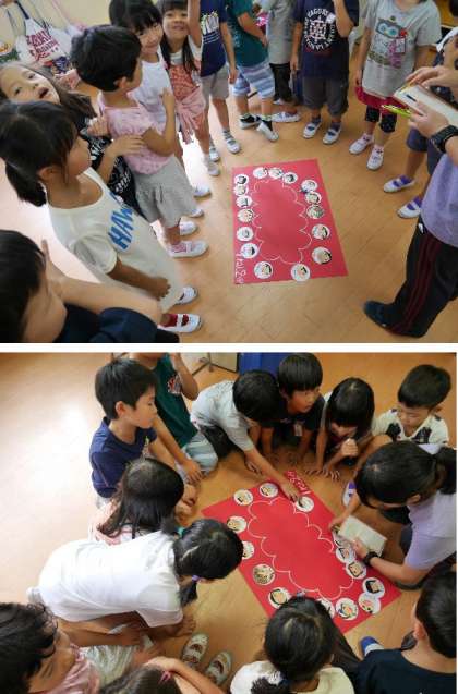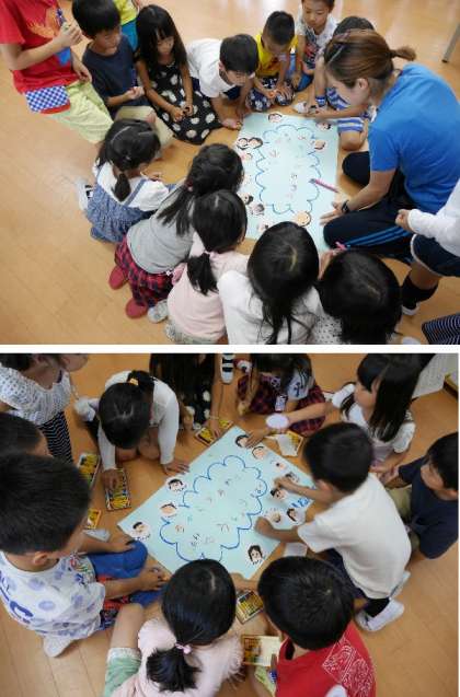 1年生が運動会の赤組と白組の応援旗を作っています。自分の顔を描いたものをはって応援メッセージを真ん中に描いていました。運動会が楽しみですね。