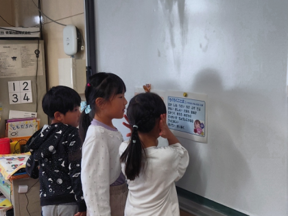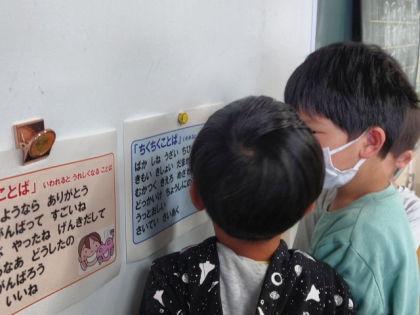 児童朝会の「ふわふわことば」と「ちくちくことば」についての校長講話を受けて、1年生のクラスでは、どんな言葉が「ふわふわことば」になるのか、みんなで考えました。