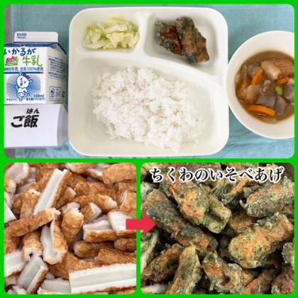 今日の献立は、ちくわのいそべあげ・あつあげとさといものみそ煮・あっさりキャベツ・ごはん・牛乳でした。