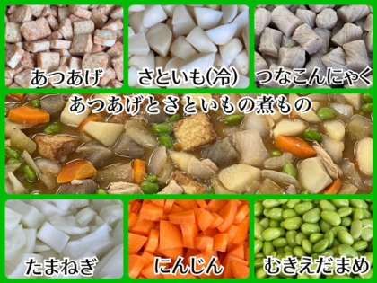 煮ものは、あつあげとさといもの他に、鶏肉・つなこんにゃく・たまねぎ・にんじん、青みにむきえだまめを使用し、砂糖・こいくちしょうゆ・赤みそで味つけして煮含めています。