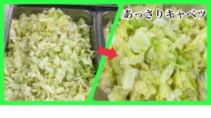 キャベツは焼き物機で蒸し、塩で味つけします。キャベツの甘みが感じられるさっぱりとしたおかずです。