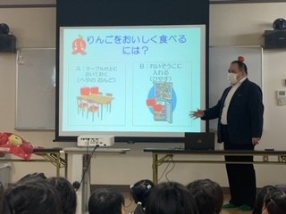 「りんごは、皮の部分が一番栄養がある」「りんごをおいしくいただくには、ポリ袋に入れて、冷蔵庫に入れるとよい」「りんごの色を付けるために、余分な葉っぱを取り除いて太陽光を当てている」などについて楽しく学習しました。